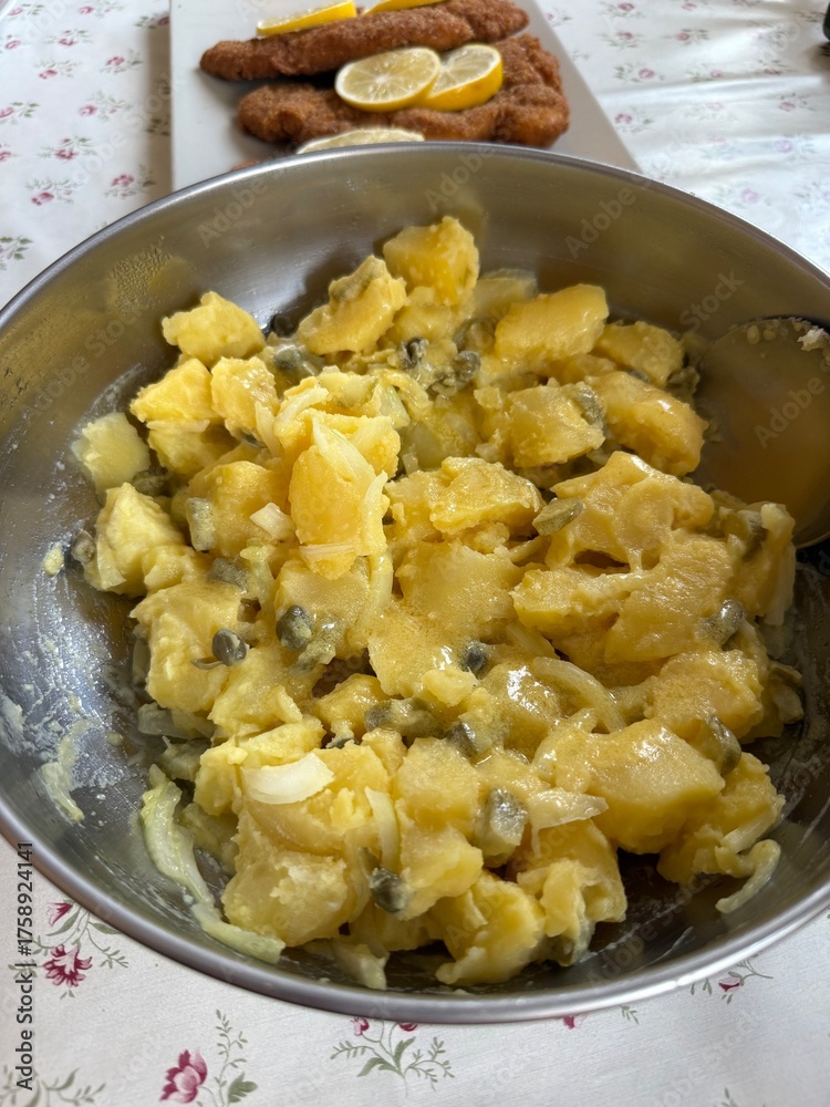 Traditional German dish potato salad usually served with schnitzel