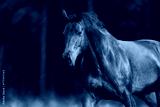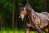 Free horse portrait in motion at summer green meadow against forest