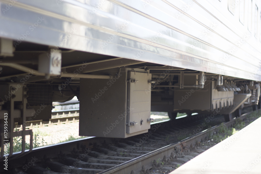 Old steam locomotive engine wheel and rods details. train on the railroad tracks