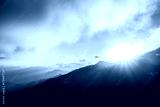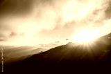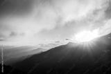 Black and white sunset photo with fog on the sky and hazy mountain range
