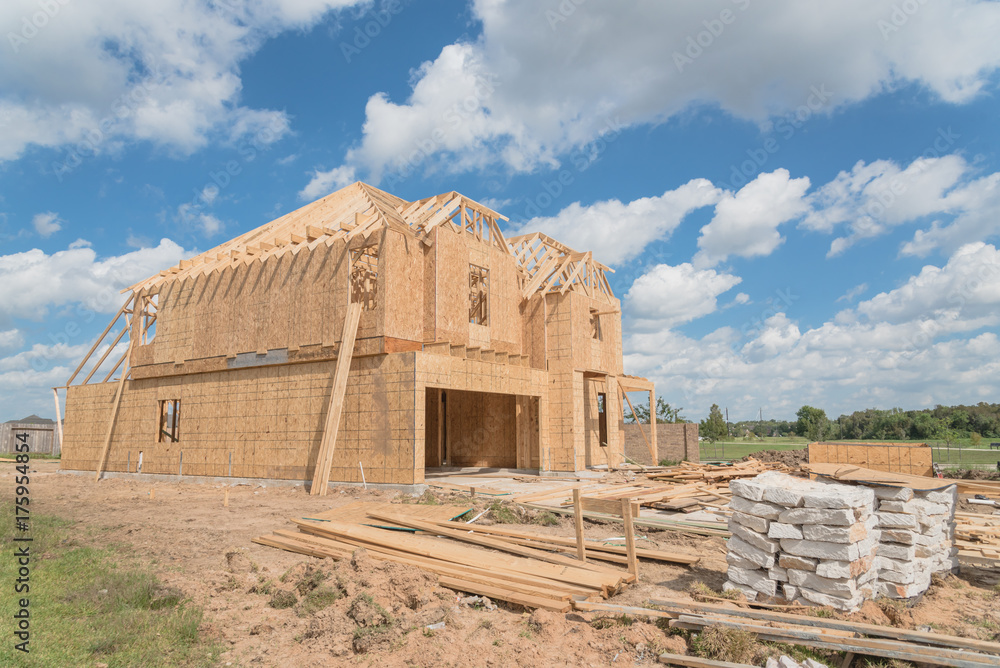 Wood frame house under construction and cloud blue sky in suburban Pearland, Texas, USA. New stick built 2 floor home wall covered by panels and sheathing. Pile of stones, sand, gravel, logs on site