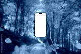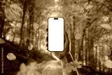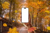 Hand holding smartphone with white screen among falling leaves in autumn forest, ideal for digital app or seasonal ad mockup