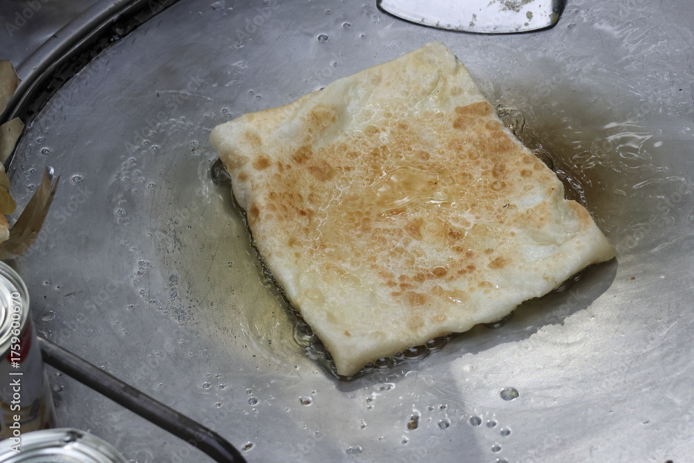 Delicious traditional roti flatbread cooks hot griddle, frying to golden brown perfection. Savory streetfood snack offers an appetizing meal, prepared fresh for breakfast, lunch, or dinner