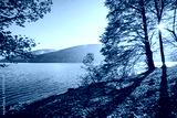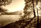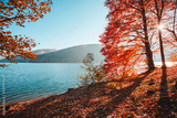 Fiery red beech trees shine in the sun on a serene lake shore on a sunny day. Atmospheric place, harmony and coziness. Carpathian mountains, Ukraine. Photo wallpaper. Discovery the beauty of earth.