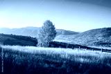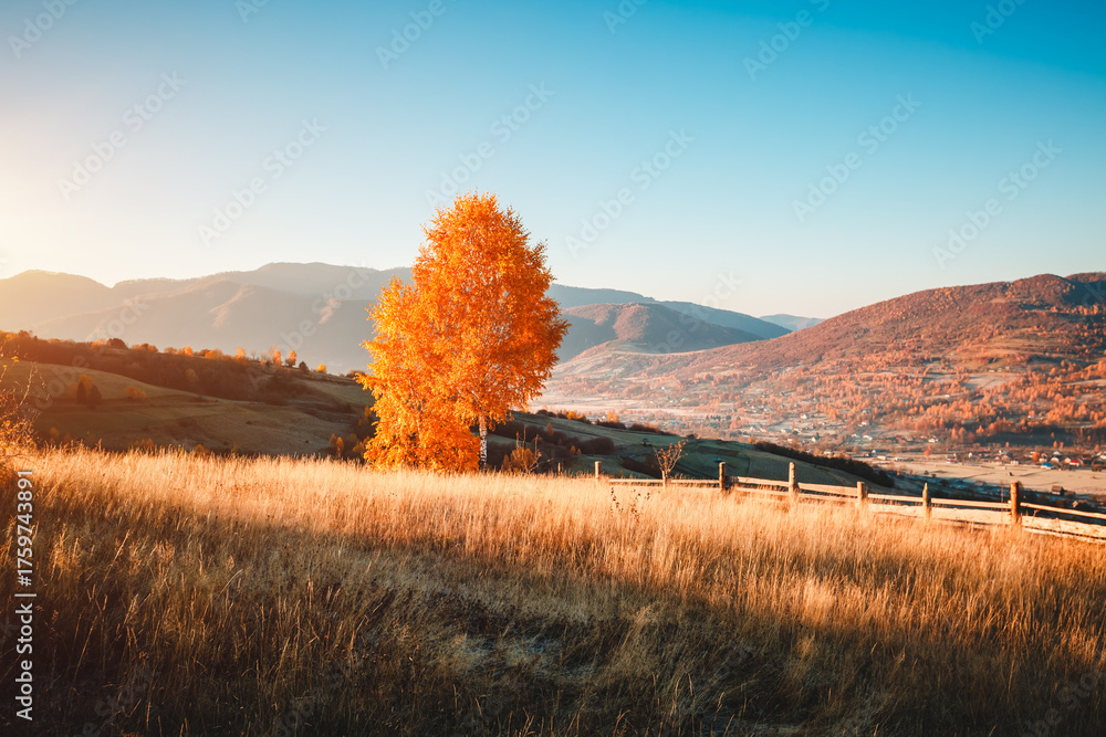 Magical autumn landscape with a lonely golden birch tree among vivid grass and hills under a clear blue sky. Incredible place, Carpathian mountains. Photo wallpaper. Discovery the beauty of earth.