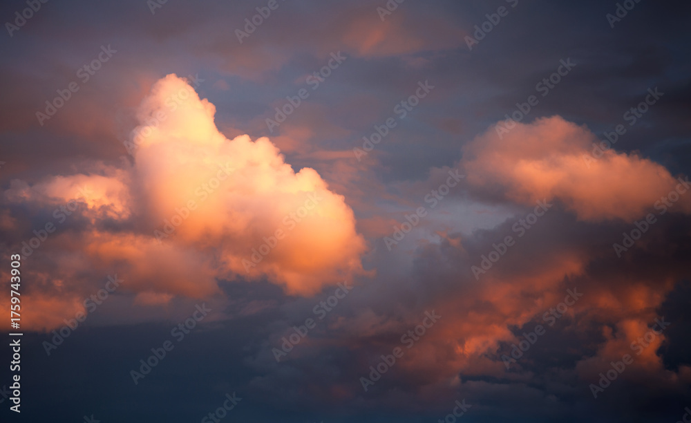 Incredible sunset with bright orange clouds illuminated by the sun during sunset. Textured and dynamic sky. Dramatic evening light and fiery orange sunset. Photo wallpaper. Beauty of earth.