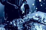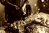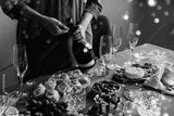 Opening a bottle of champagne or sparkling wine during a dinner party. Christmas of New Year celebration concept.