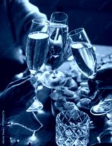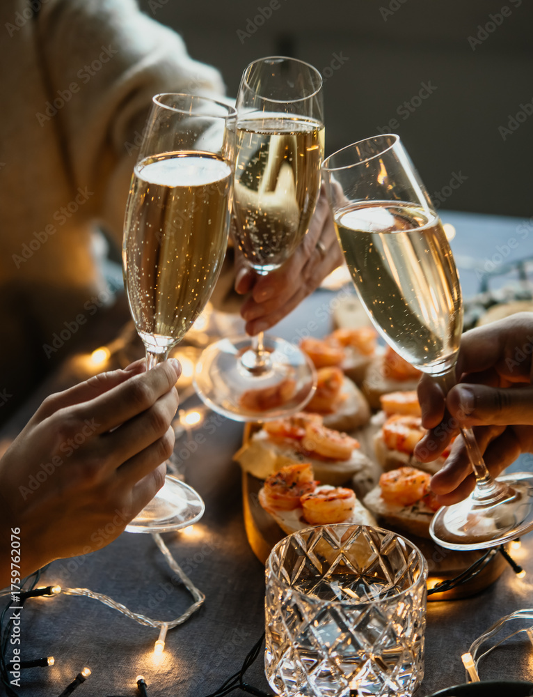 Friends celebrating Christmas or New Year eve party with champagne or sparkling wine.