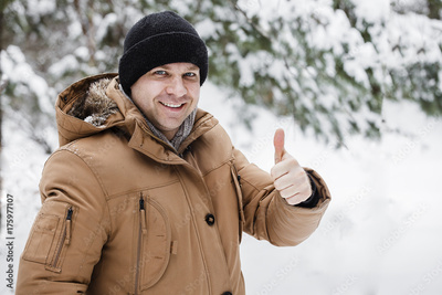 Happy active man showing thumbs up, everything is OK and good. Winter vacation