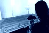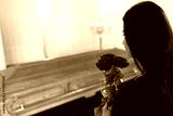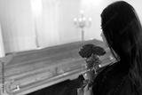 woman with red roses and coffin at funeral