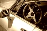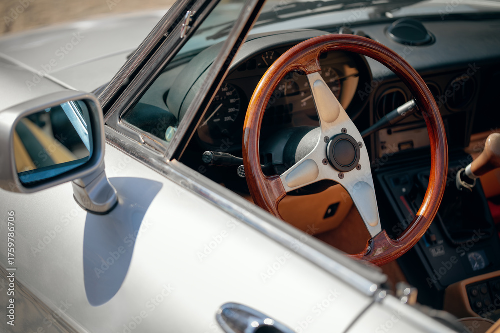 Detailed view of a vintage car's interior, showing the wood and metal steering wheel and side mirror.