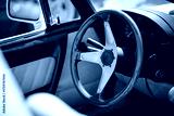 Detailed view of a vintage car's interior, showing the wood and metal steering wheel and side mirror.