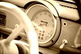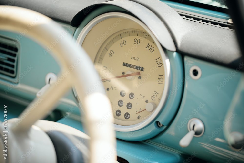 Close-up of a stylish, light blue retro car dashboard with a creamy vintage-style speedometer and steering wheel.
