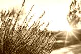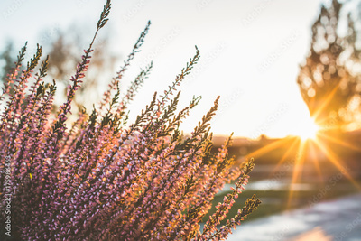 Blooming purple heather at sunset. Flower background