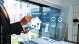 Professional analyzing property tax return form with virtual screen interface and tablet, financial and investment concept
