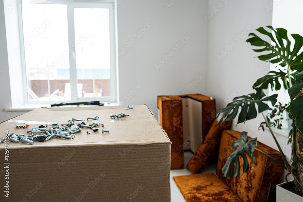 assembling modern furniture at home, assembling sofa in a stylish apartment. a room during the relocation and assembly of furniture, sofas Real-life moment of assembling furniture, modern life. moving