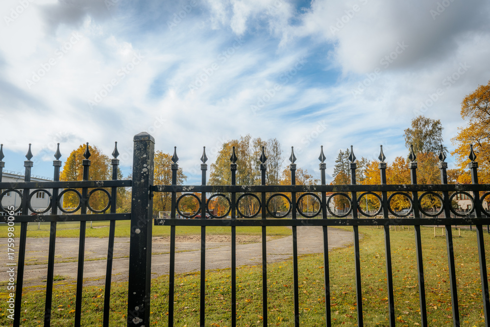 A decorative black iron fence with spearheads surrounds a grassy park area with autumn trees and a cloudy blue sky in the background. Visible space for text.