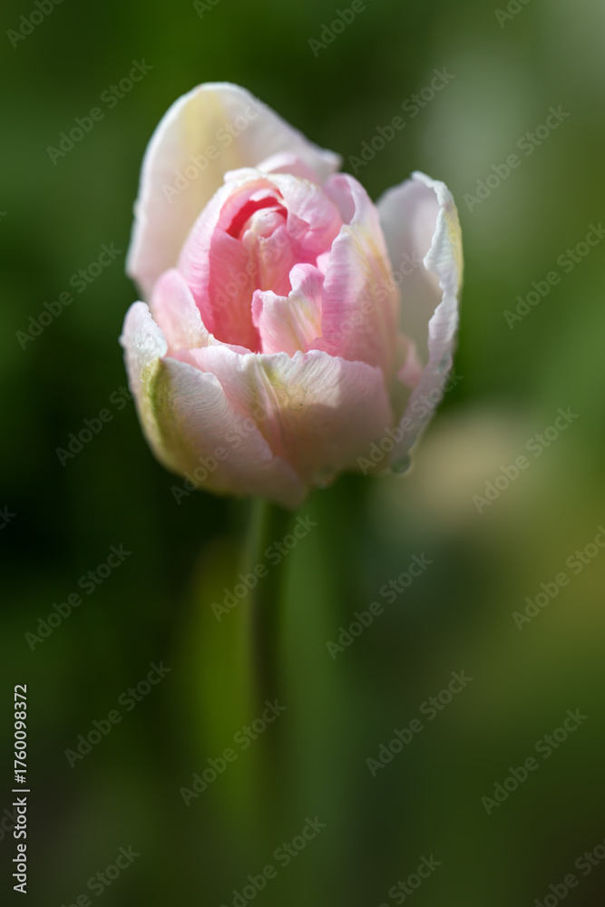 Romantic pink tulip with soft dreamy background, vertical floral banner, wedding greeting, Valentine s Day design, pastel tones, spring holiday card, nature inspired romantic template