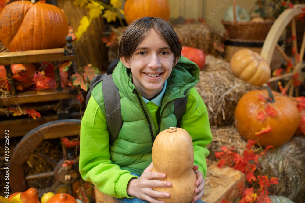 A portrait of a 13-year-old boy holding a pumpkin in his hands