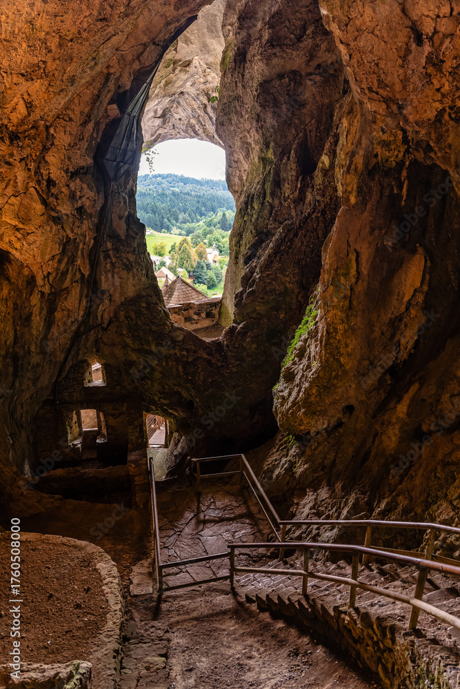 Interior of the cave carved into the rock of Predjama Castle overlooking the outside, Slovenia.