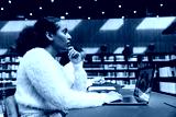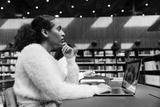 A female student looks thoughtfully in front of her while keeping her hand on a laptop and sitting at a desk