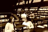 Two female students are talking and sitting at a table while two other female students are standing and talking next to them