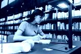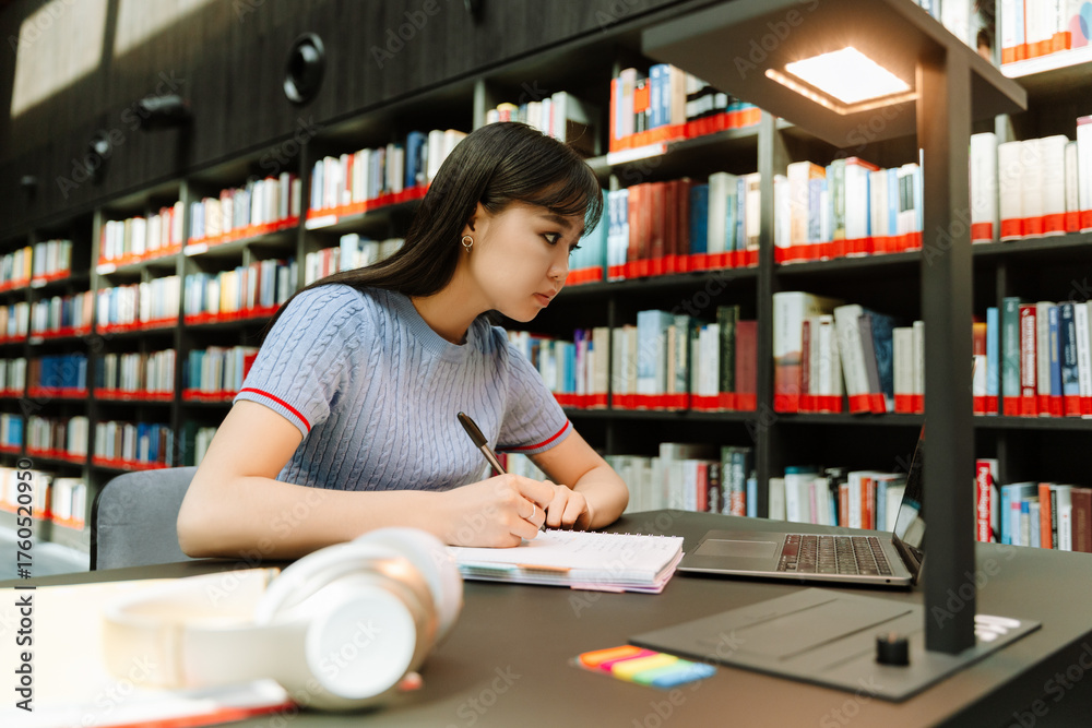 A female student is holding a pen over a notebook and looking at a laptop while sitting at a desk
