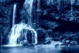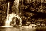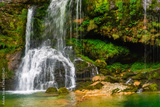 Cascading water flows down moss-covered rocks into a crystal-clear emerald pool, surrounded by lush forest, creating a serene and picturesque landscape in slap virje, slovenia