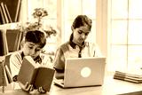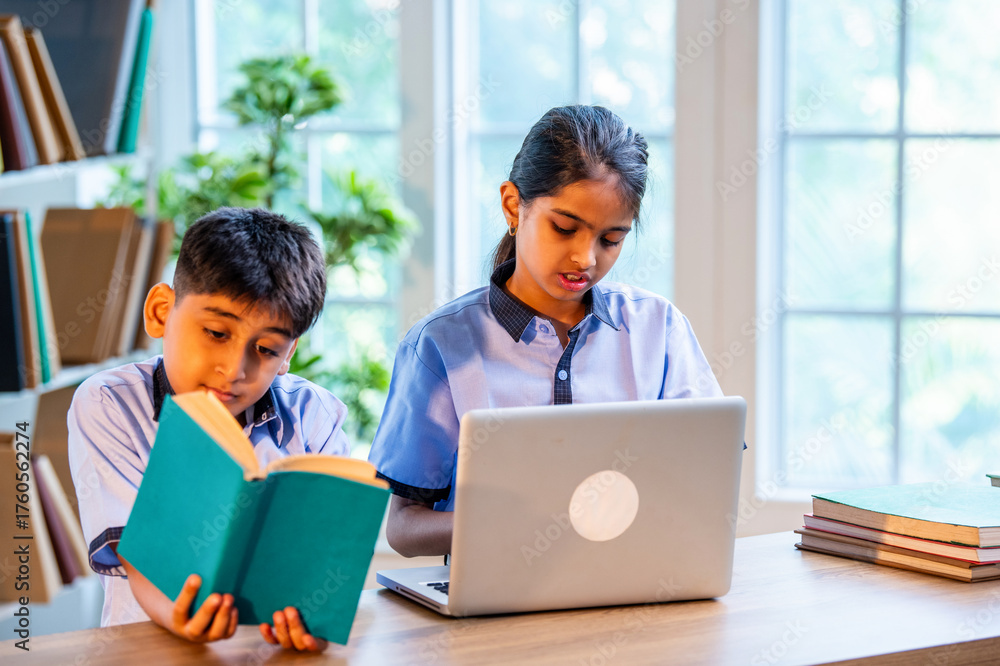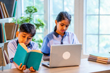 Indian Students in school uniforms study together on laptop in classroom in group learning session