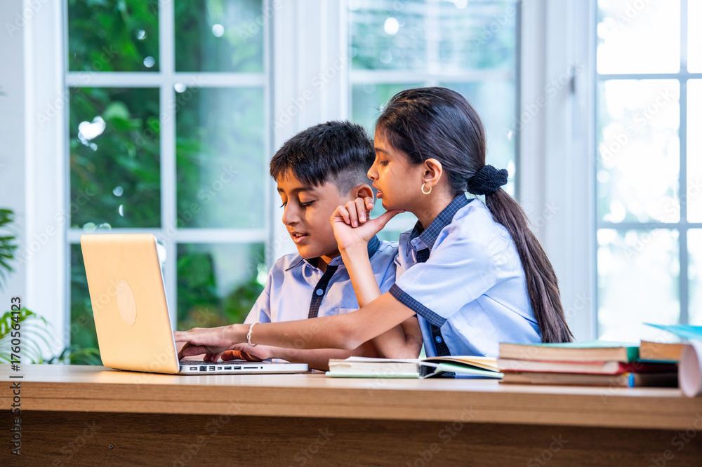 Indian Students in school uniforms study together on laptop in classroom in group learning session