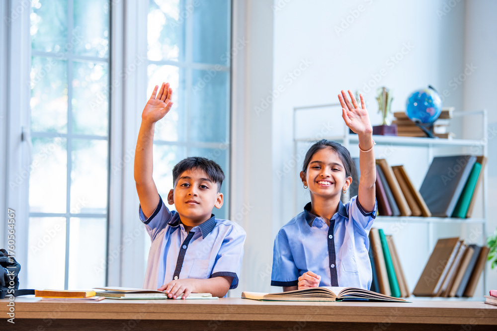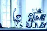 Indian Students in school uniforms raise hands to answer teacher’s question during classroom session