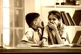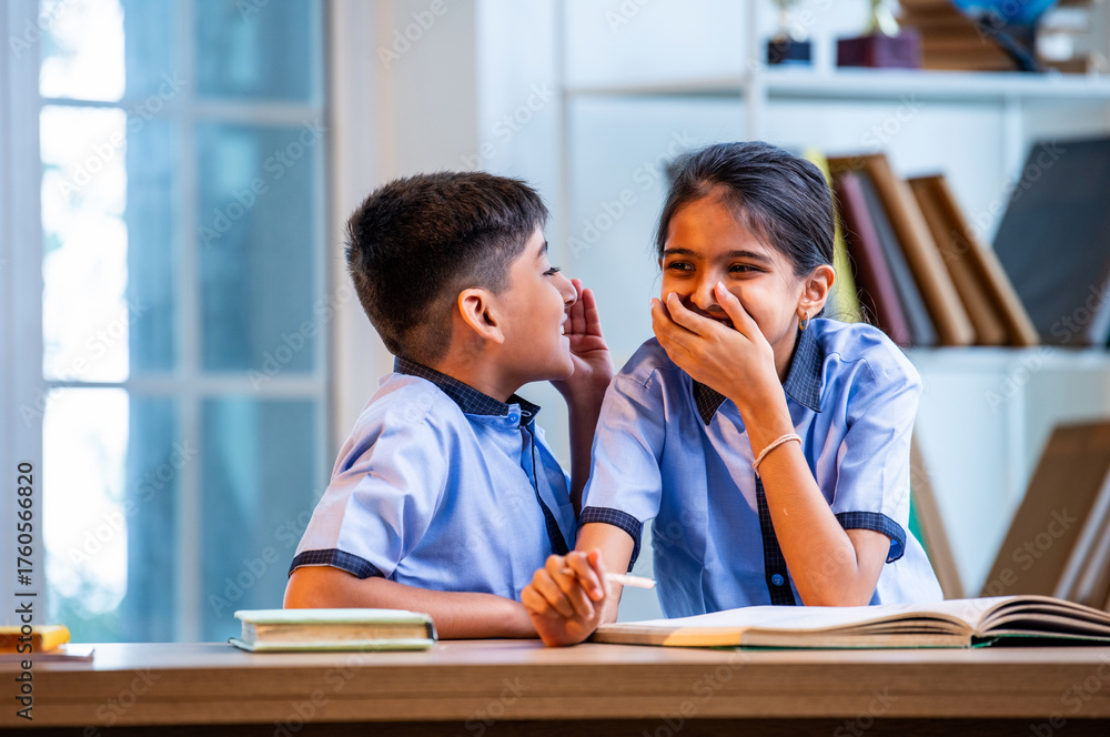 Indian Students in school uniforms share secrets and laugh quietly during break in classroom