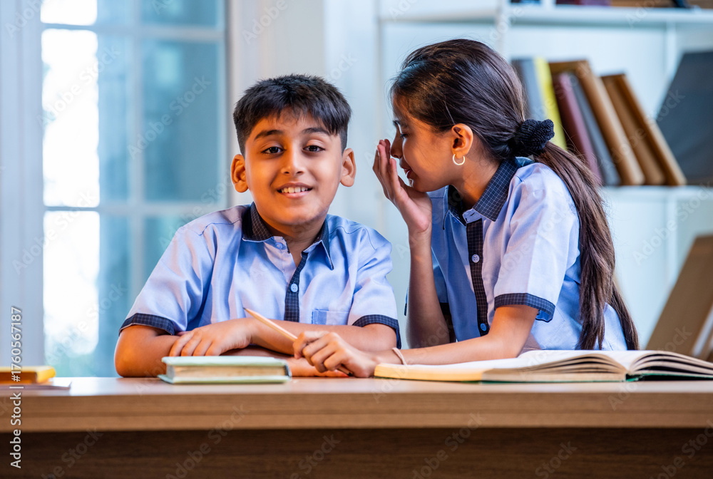 Indian Students in school uniforms share secrets and laugh quietly during break in classroom