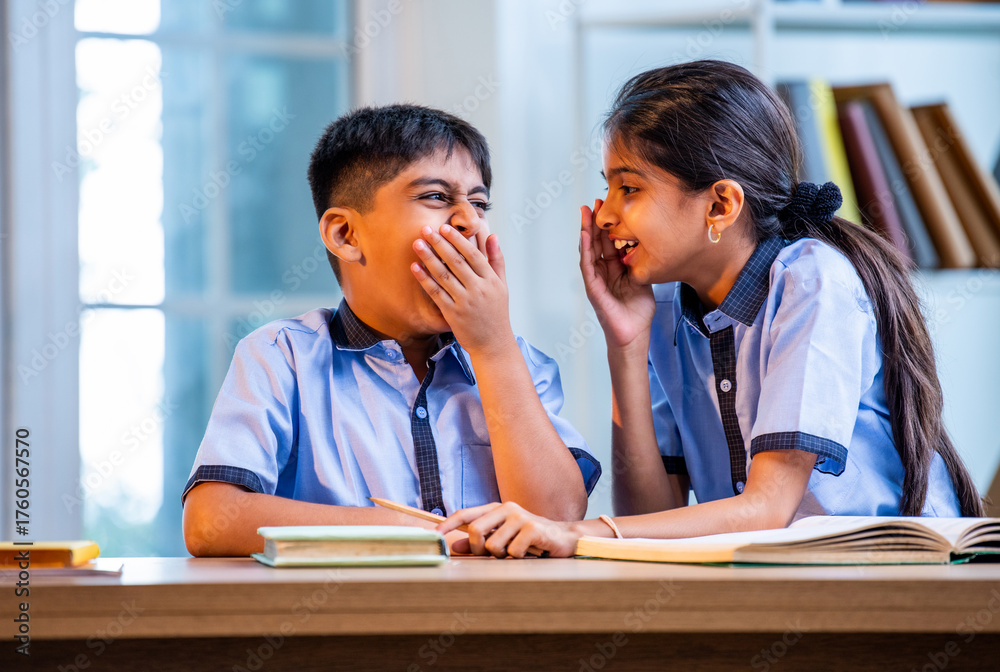 Indian Students in school uniforms share secrets and laugh quietly during break in classroom