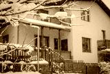 Exterior of house or cottage covered in deep snow in winter