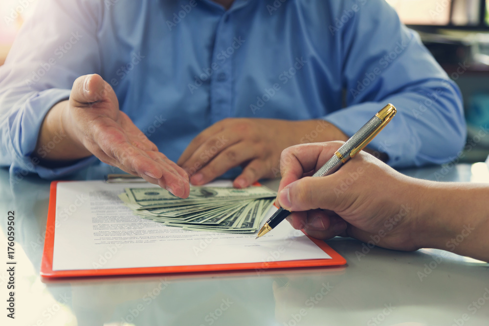 Business and finance concept, Hand of a businessman giving money to his partner when sign contract