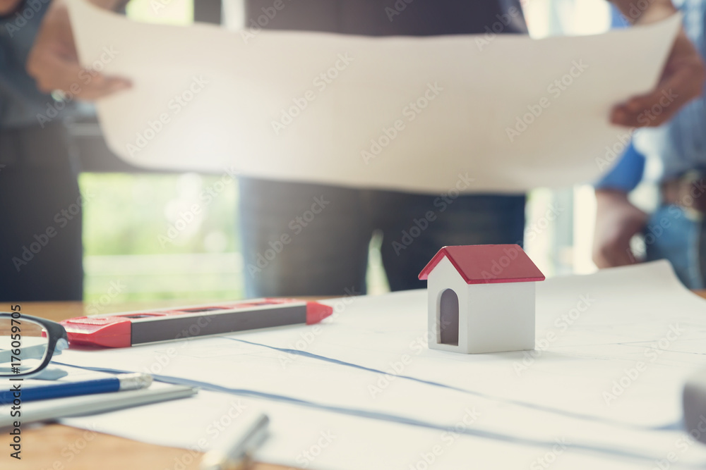 Engineer and Architect concept, Engineer Architects office team working and discussing house plan model, Vintage Effect