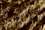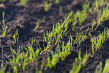 Lush and vibrant green grass sprouts are emerging beautifully from the dark, rich soil