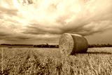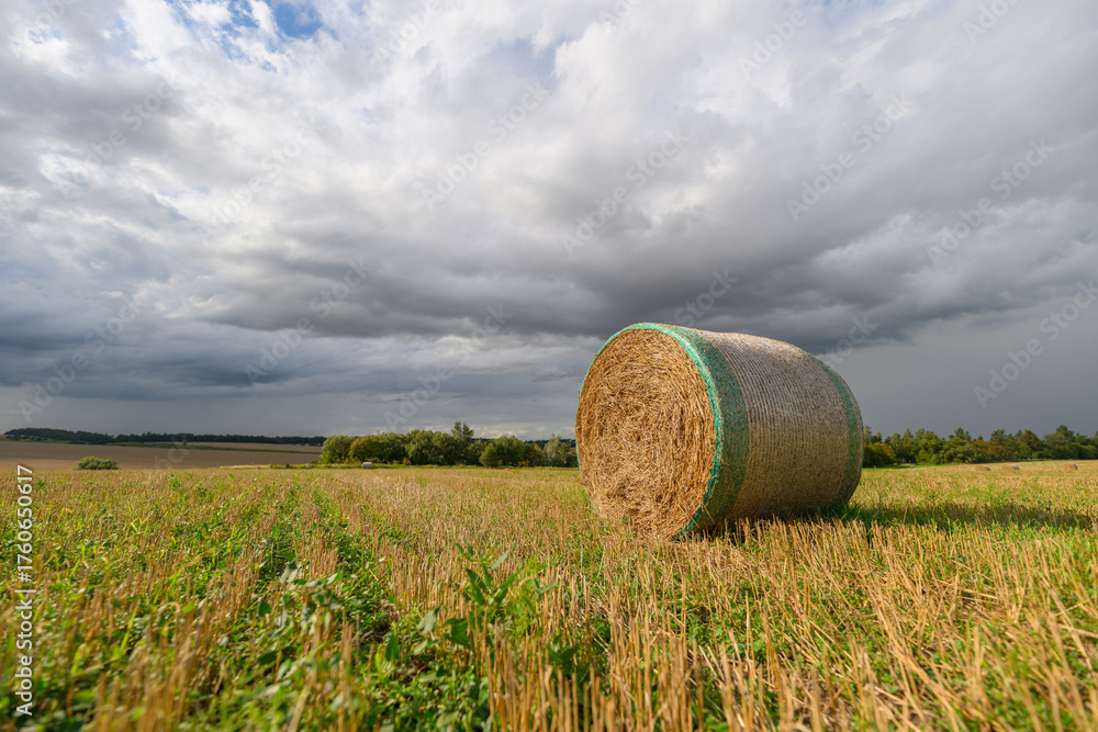A Beautiful Scenic Rural Landscape Featuring a Hay Bale Set Against Dramatic Clouds Above