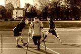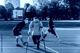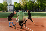 A group of three men are stretching their legs and two of them are leaning on the ground with crutches