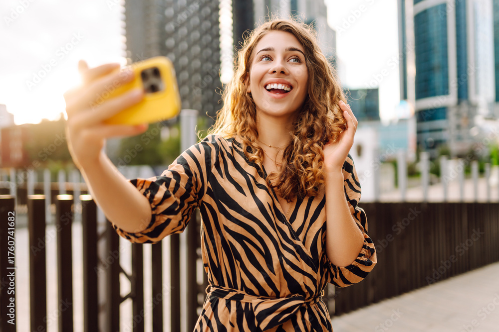 A happy woman takes a selfie on her phone against the backdrop of a modern cityscape. A beautiful tourist with a phone blogs and enjoys a sunset trip. Concepts of blogging, leisure, and urbanity.