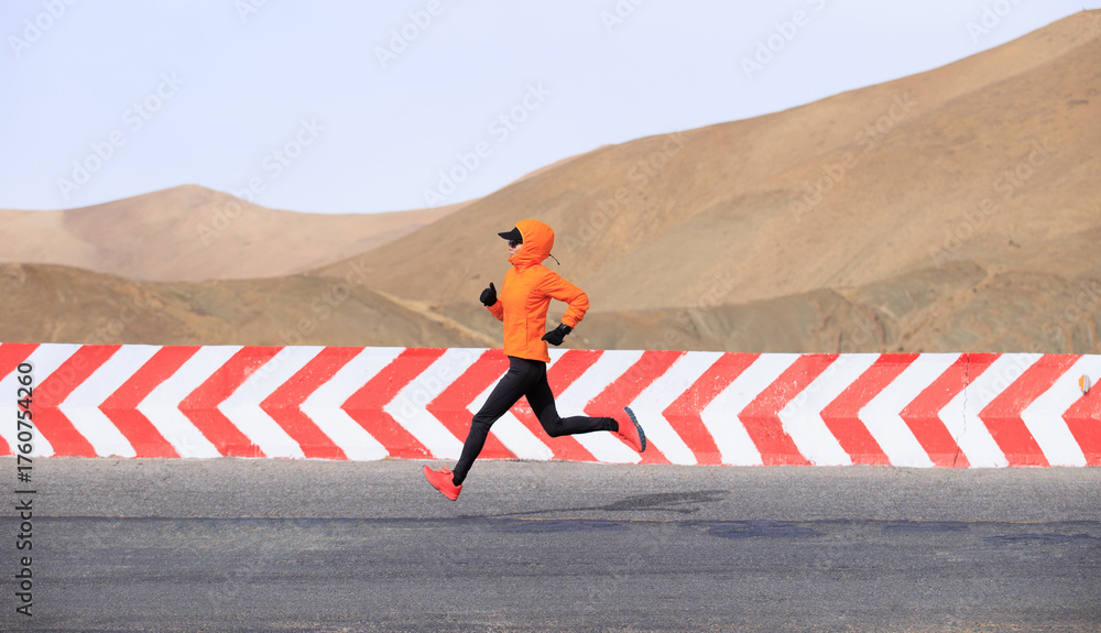 Fitness woman trail runner running on trail leading to Mount Everest in tibet, China