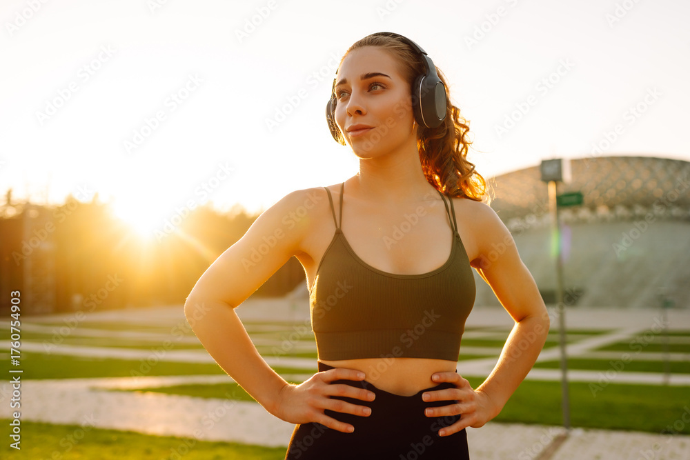 A fit woman wearing wireless headphones stretches at sunset. A beautiful woman in activewear exercises in an outdoor park and listens to music. Concept of sports, music, outdoor.