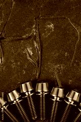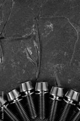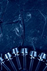 A row of blue Titanium bicycle screws on a black textured background with free space