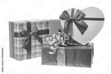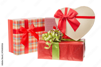 Gift boxes with red ribbons for Valentines day or Christmas, new year. Isolated on white