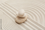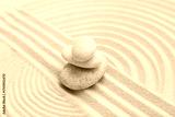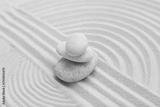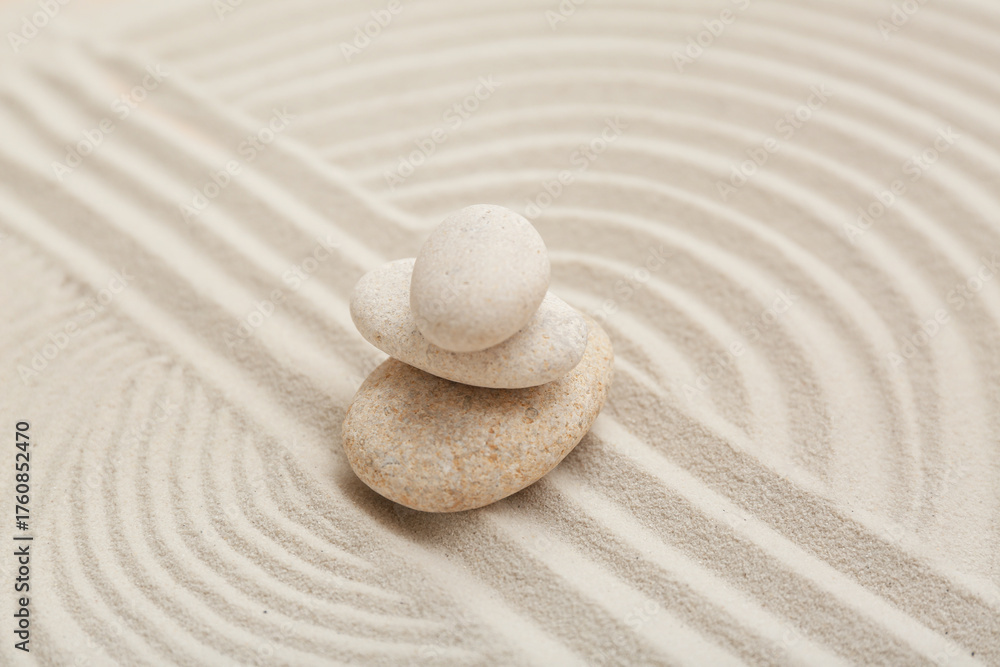 Beautiful composition with spa stones and lines on sand as background, closeup. Zen concept