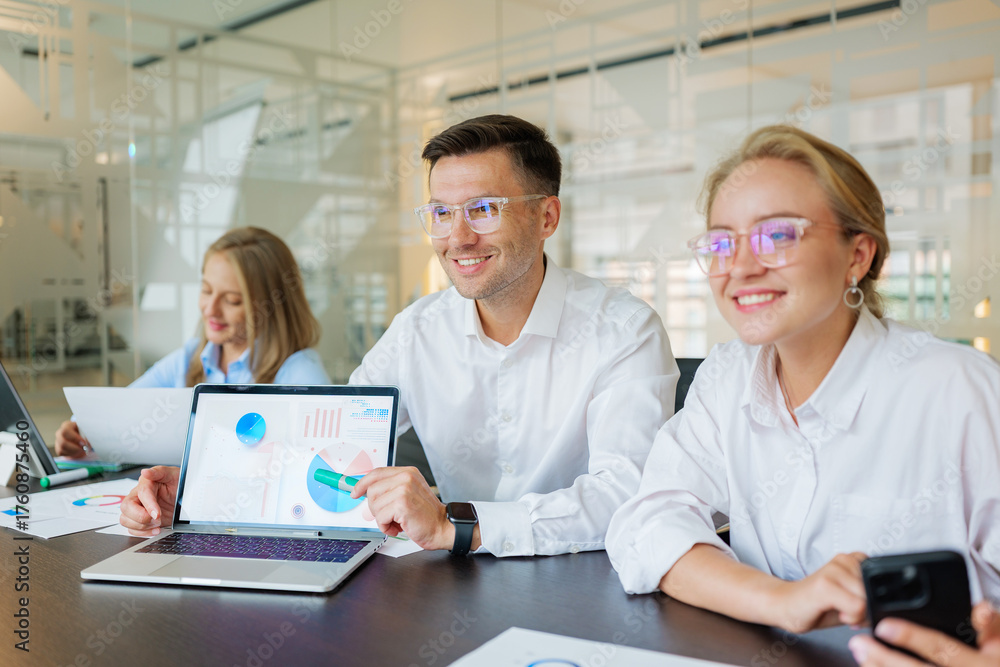 Group of professionals collaborating in a modern office with digital presentations and documents