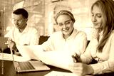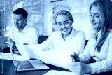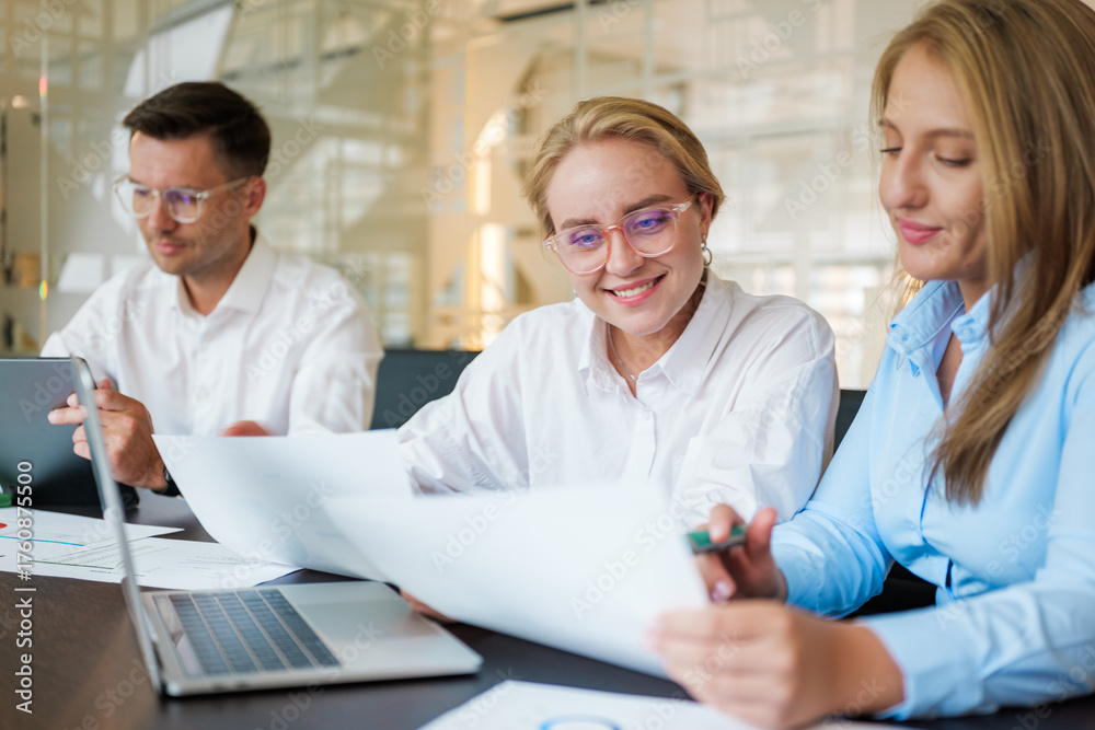 Team members collaborate on a project while reviewing documents in a modern office environment
