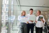 Group of professionals collaborating in a modern office space while discussing ideas and reviewing documents