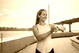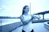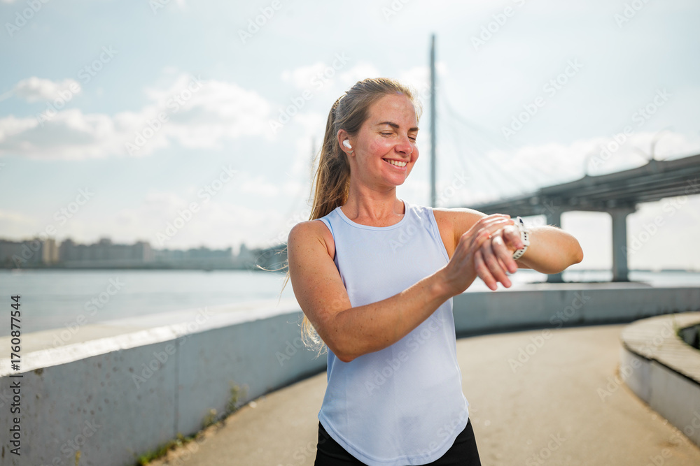 Woman checking fitness tracker while jogging along riverside path in sunny weather